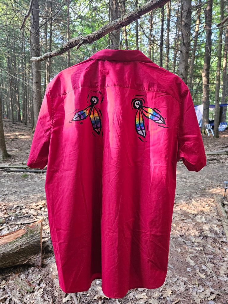 Red Dress imagery, which emphasizes Indigenous femininity, has been critiqued as gender essentialist, particularly in its potential erasure of Two-Spirit people. With this in mind, I wanted to create a garment that incorporated a men’s red dress shirt and specifically invoked Two-Spirit imagery.
